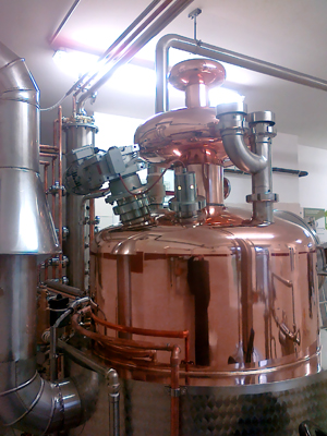 | Üst: | Töltésszintig 1.4301 rozsdamentes acélból, felsőrész mángorlással (hengergörgőzéssel) tömörített vörösrézből, hegesztett kivitelben, ráépített keverővel, gőz/vízköpennyel, a fűtési módnak megfelelő tűztérrel. Mángorlással (hengergörgőzéssel) tömörített vörösrézből készült egyedi tervezésű lencse alakú sisakkal, melynél a tányérhatás miatt a gőz és folyadék fázis között hosszabb lesz a kontaktidő, ezáltal erősebb a reflux képződés. |